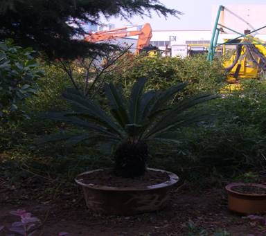 公司共有四棵盆栽的鐵樹,花壇中有兩棵,在門廳旁有兩棵。這些鐵樹的生命力著實頑強!今年才將原來栽種它們的花盆換了,因為原先盛放它們的花盆被它們撐裂了!其實買來的這個也就不能叫盆了,賣盆的人說是“龍缸”,因為這個盆本身特別大而且上面還畫有龍。不過我覺得能栽種上有這么頑強生命力的物種,那確實也應該叫做“龍缸”!