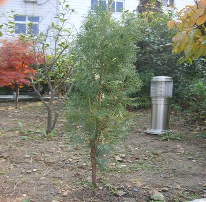 花壇中這些樹木周圍是幾顆小柏樹,高還不到半米,翠綠翠綠的,好看極了。柏樹:柏科植物的通稱,裸子植物門,松杉綱的一科。常綠喬木或灌木。柏樹斗寒傲雪、堅毅挺拔,乃百木之長,素為正氣、高尚、長壽、不朽的象征。